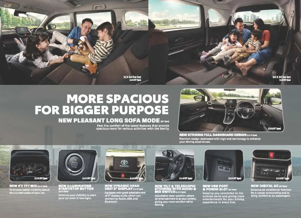 Interior All New Avanza kini lebih luas dan modern. Dilengkapi dengan Long Sofa Mode, ciptakan kenyamanan untuk keluarga saat di perjalanan.
