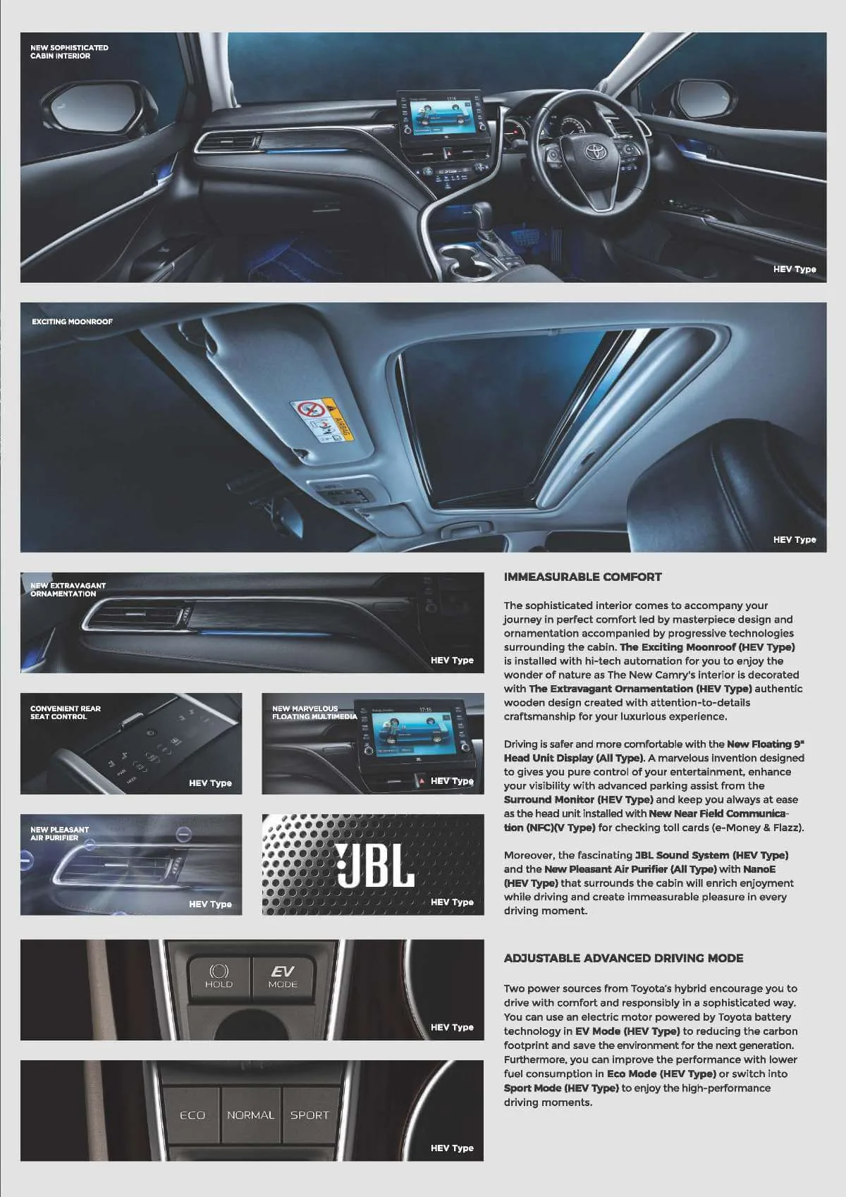 Efisiensi konsumsi bahan bakar sekaligus performa yang tetap superior siap diberikan oleh Camry bermesin hybrid. Ditambah beragam fitur berteknologi tinggi tentu siap menghadirkan kenyamanan ekstra untuk penumpang.