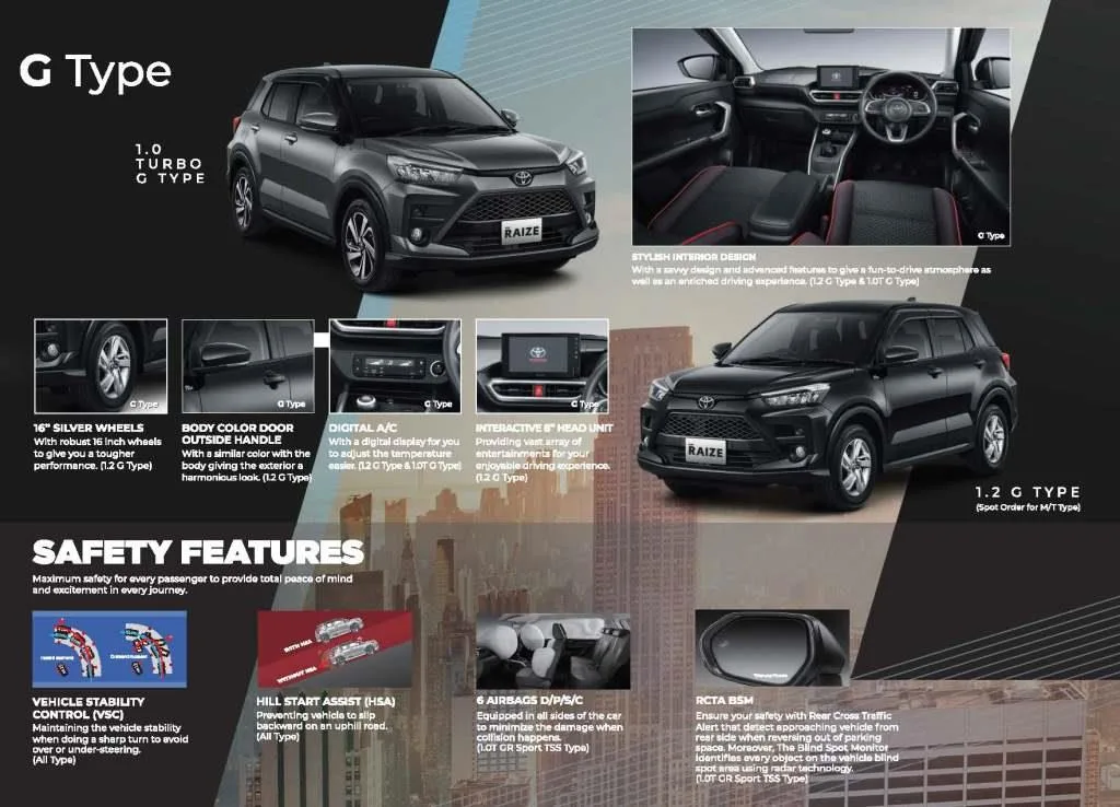 Penampilan All New Raize yang stylish dan modern ini tentu sangat cocok bagi Tunas Friends yang berjiwa muda atau bagi keluarga muda. Selain menonjolkan penampilan, Raize hadir dengan performa mesin yang manakjubkan, serta fitur keselamatan yang sangat lengkap.