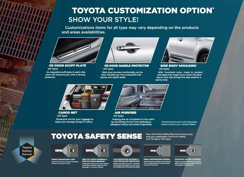| 2.7 SRZ WITH GR PARTS AERO PACKAGE 4x2 A/T ONE TONE (Non Premium Color) | IDR 672.795.000 |