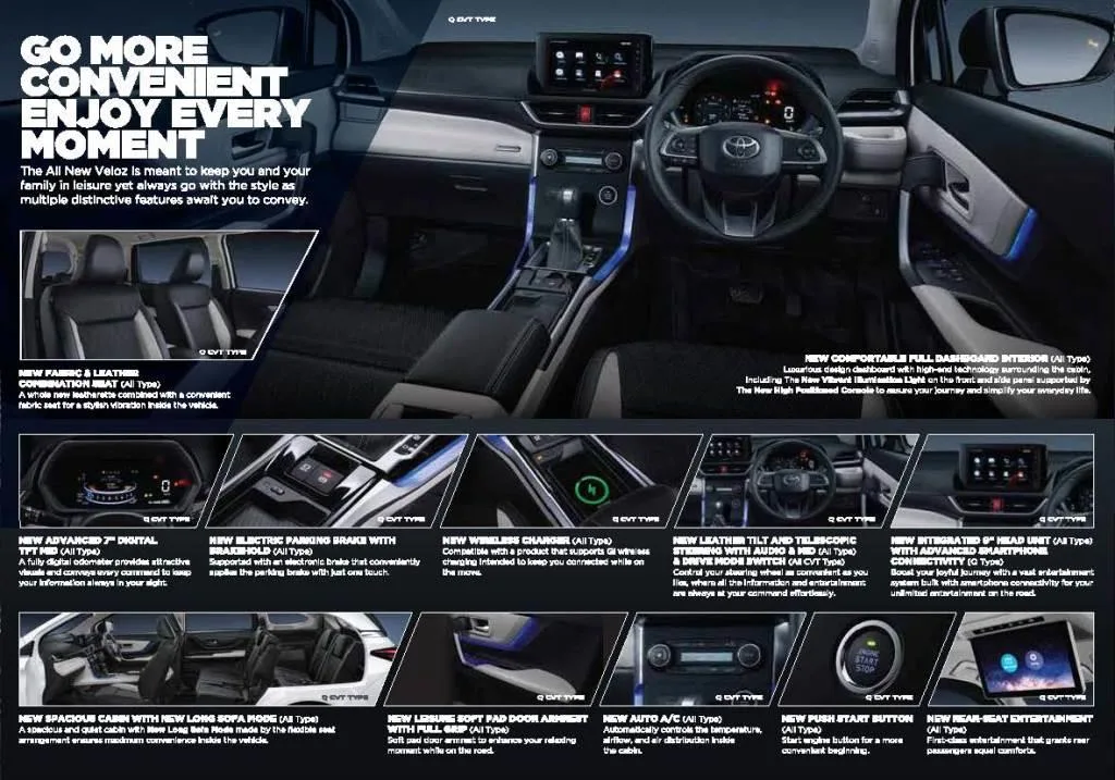 Untuk bisa semakin baik dalam menemani Anda dalam perjalanan sehari-hari, Toyota Veloz juga menawarkan beragam fitur menarik untuk Anda. Mulai dari fitur Push Start/Stop Button, fitur Electric parking Brake with Brakehold yang dapat membantu Anda dalam kemacetan, hingga fitur Wireless Charger.