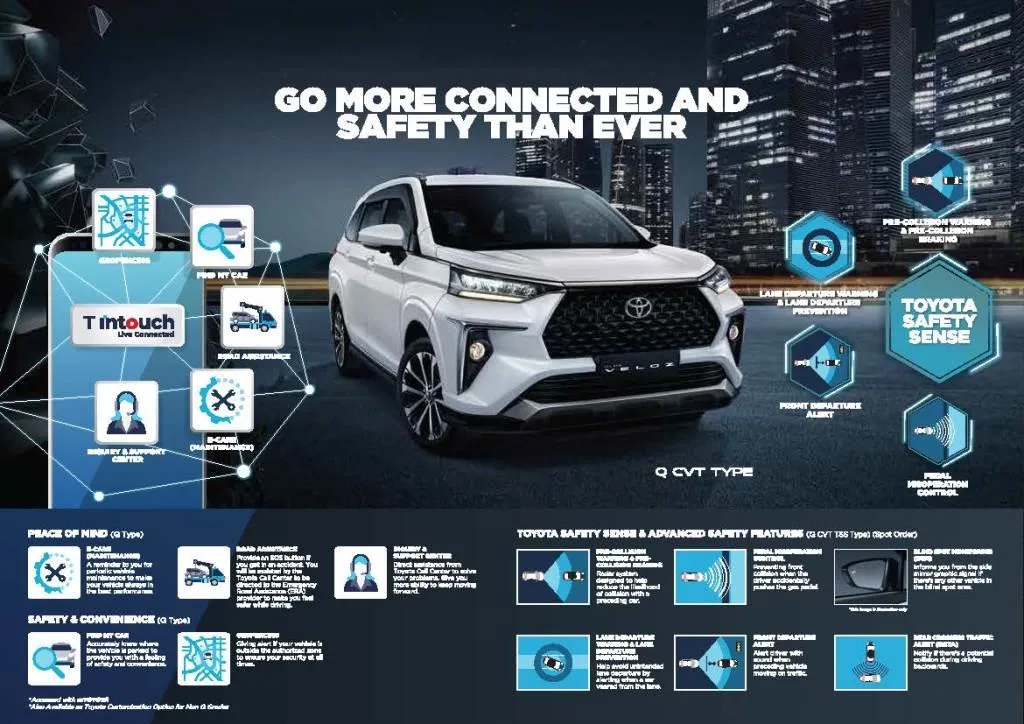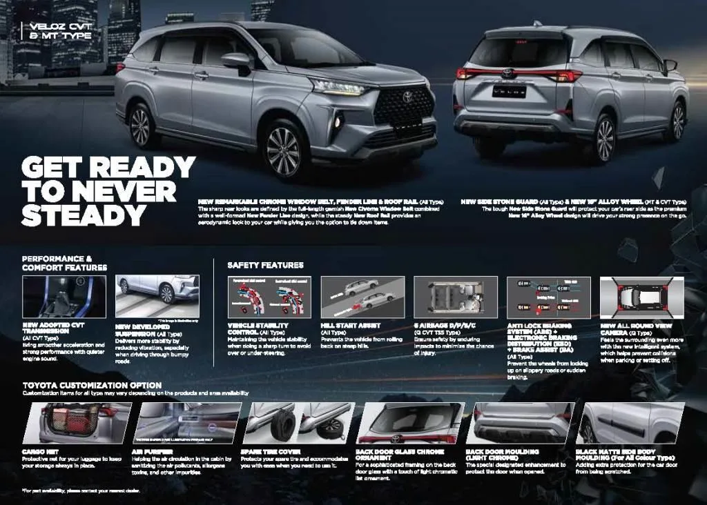 Untuk bisa semakin baik dalam menemani Anda dalam perjalanan sehari-hari, Toyota Veloz juga menawarkan beragam fitur menarik untuk Anda. Mulai dari fitur Push Start/Stop Button, fitur Electric parking Brake with Brakehold yang dapat membantu Anda dalam kemacetan, hingga fitur Wireless Charger.